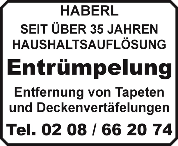 HABERL SEIT ÜBER 35 JAHREN HAUSHALTSAUFLÖSUNG Entrümpelung Entfernung von Tapeten und Deckenvertäfelungen Tel. 02 08 / 66 20 74